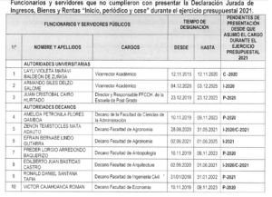 En el Informe de Orientación de Oficio N° 017-2021-OCI/UNCP/0199-SOO (Período de evaluación del 01 de octubre al 28 de octubre 2021) se advierte que 25 decanos, 15 directores académicos, 31 directores universitarios y 9 directores universitarios de esta Primera Casa Superior de Estudios no presentaron sus declaraciones juradas, tal como lo señala el Art. 2 de la Ley N° 27482, Ley que contempla a rectores, vicerrectores, decanos entre otros funcionarios del Estado.