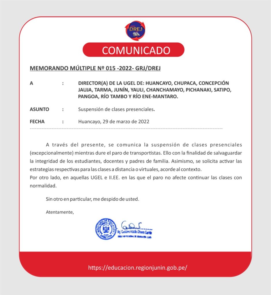 La Dirección Regional de Educación de Junín suspendió las clases presenciales, de manera extraordinaria, debido al paro de transportistas y agricultores, quienes bloquean las carreteras y vías de acceso a Huancayo y las demás ciudades de la región Junín.