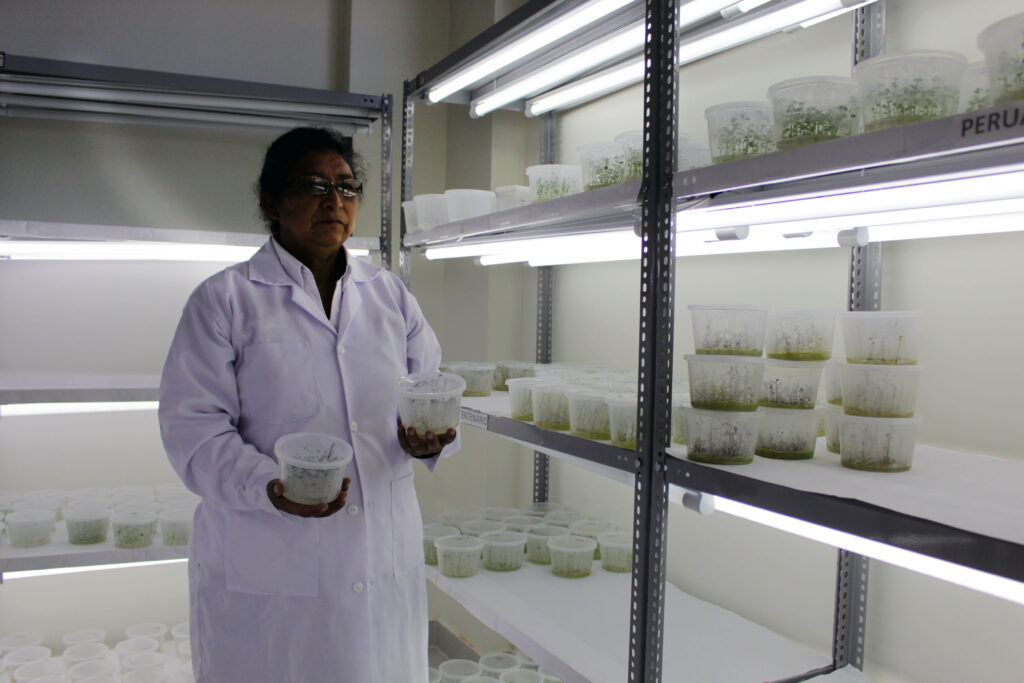 “Producimos por un proceso de termoterapia, las plantas libres de virus para darle semilla nueva a los agricultores y puedan incrementar su rendimiento”, dice la agrónoma egresada en 1978 de la Universidad Nacional del Centro del Perú, y hoy jefa del Programa Nacional de Raíces y Tuberosas.