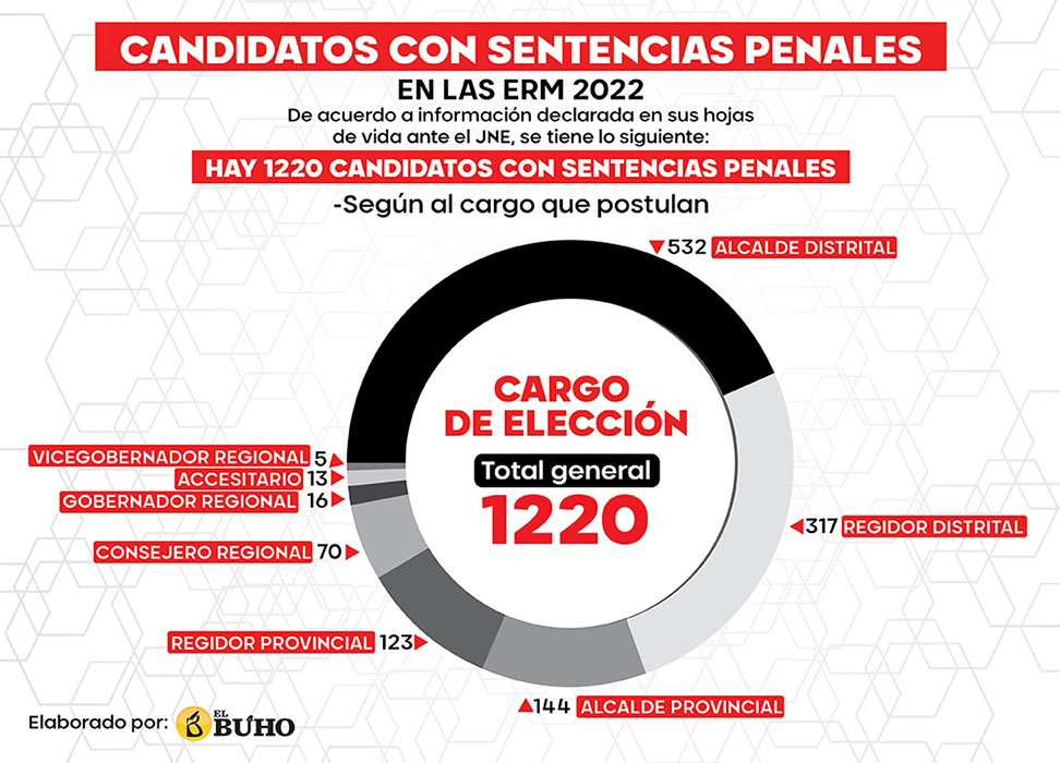 En este proceso se han inscrito más de 11 mil listas electorales para los gobiernos regionales y municipales, según el Jurado Nacional de Elecciones. En este escenario, la Red de Medios Regionales del Perú, de la cual Huanca Yor Times es parte, examinó la información declarada por los postulantes al ente electoral e identificó a mil 220 candidatos que consignaron sentencias penales en su hoja de vida.