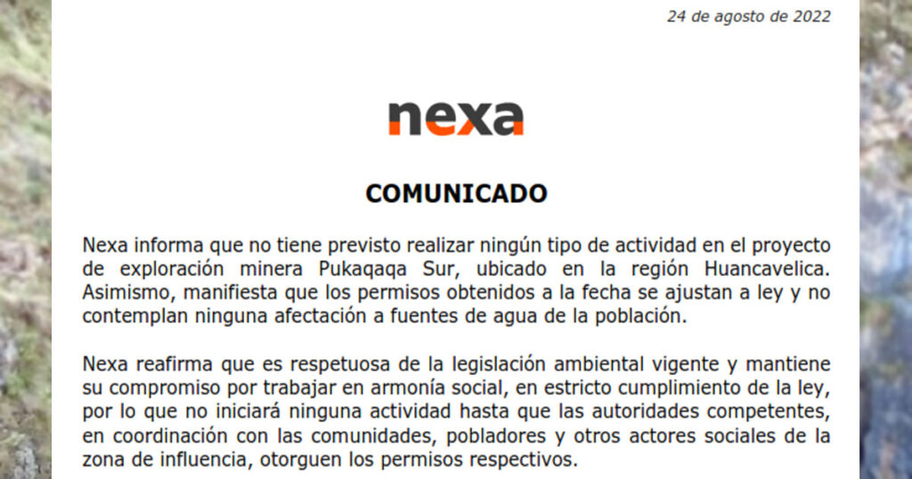 En un escueto comunicado, la empresa Nexa Resources indicó que “no tiene previsto realizar ningún tipo de actividad en el proyecto de exploración minera Pukaqaqa Sur, ubicado en la región Huancavelica” y ratificó que los permisos que obtuvo “se ajustan a ley” y negó que contemplan alguna “afectación a fuentes de agua de la población”.