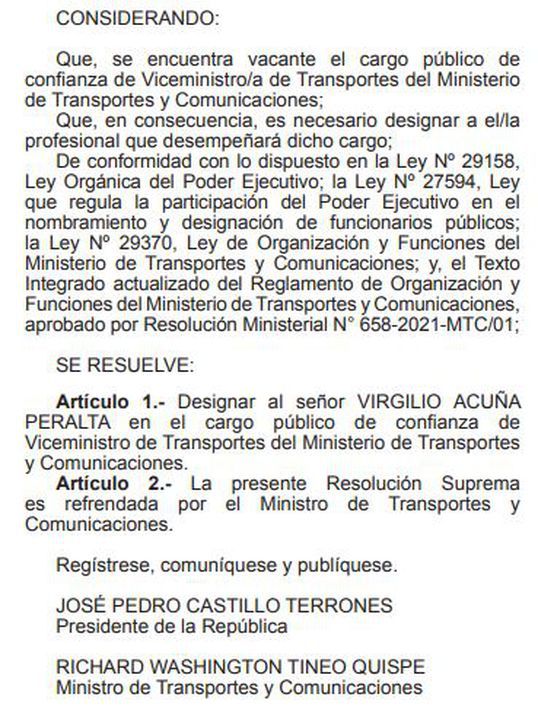 En medio del tercer día del paro indefinido del transporte de carga pesada, el Gobierno nombró este jueves como Viceministro de Transportes al excongresista Virgilio Acuña Peralta, con la Resolución Suprema N° 020-2022-EM, publicada en el diario oficial El Peruano.