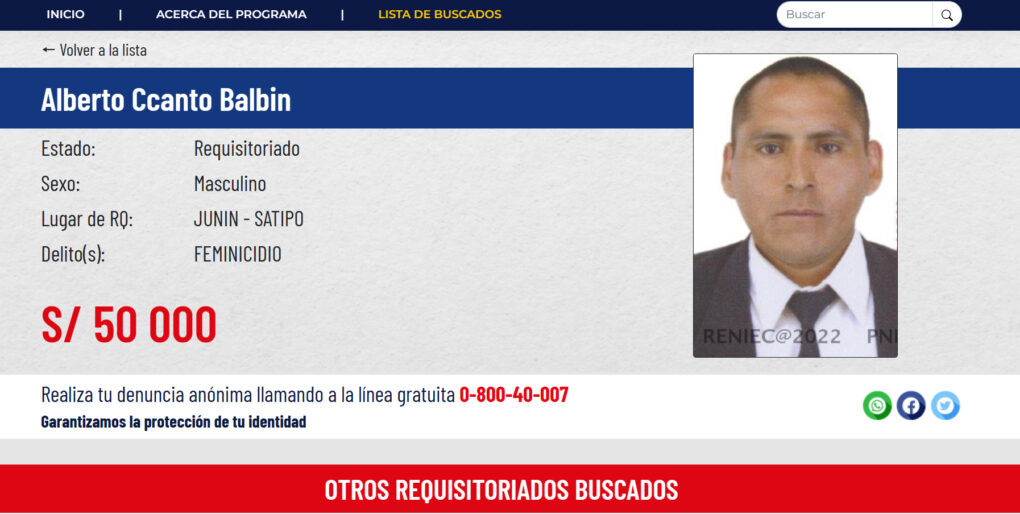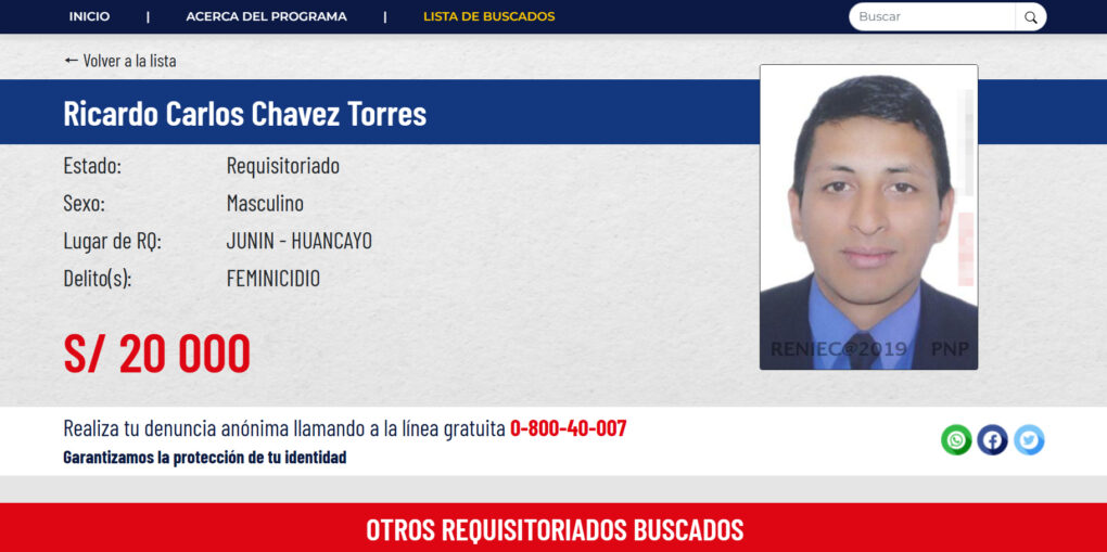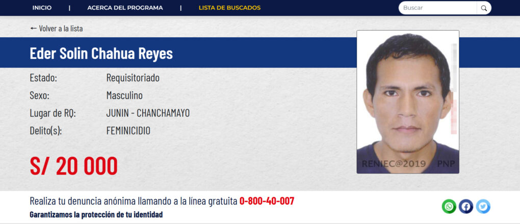 Hay cuatro hombres y una mujer con orden de captura por feminicidio o intento de feminicidio en Junín. El Ministerio del Interior ofrece recompensas de entre 20 y 50 mil soles por información que ayude a capturarlos. El último de Huancayo en ser incluido en el programa fue Ricardo Chávez Torres, quien mató de múltiples puñaladas a su pareja en Chilca.