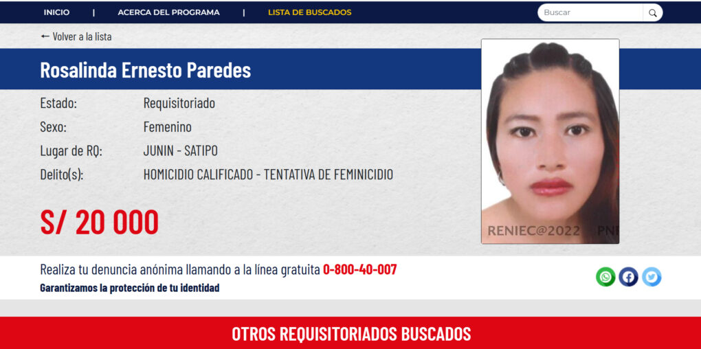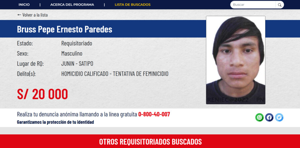 El programa ofrece recompensa entre 20 y 50 mil soles por información que ayude a capturarlos.