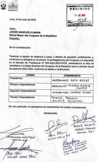 Este martes 25 de julio es el último día para que los congresistas presenten ante la Oficialía Mayor del Congreso, su lista de postulantes para la nueva Mesa Directiva que el 28 debe recibir a la presidenta Dina Boluarte y escuchar su mensaje a la Nacion.