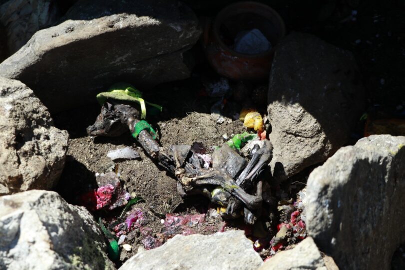Entre los residuos de mayor cantidad se encuentran botellas de vidrio de bebidas alcohólicas, botellas de plástico, bolsas, platos descartables, envolturas de caramelos, chocolates, galletas, diferentes sustancias utilizadas en las ceremonias ancestrales y fetos de llamas.