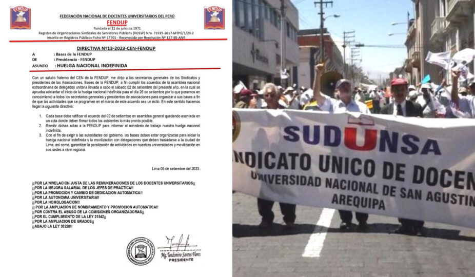 Miles de docentes de 52 universidades públicas acatarán un paro nacional indefinido convocado por la Federación Nacional de Docentes Universitarios del Perú (FENDUP). En Arequipa, serán 1800 docentes de Universidad Nacional San Agustín (UNSA) quienes no realizarán sus labores académicas hasta obtener una respuesta del Ejecutivo. En el pliego de reclamos se encuentra el incremento […]