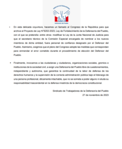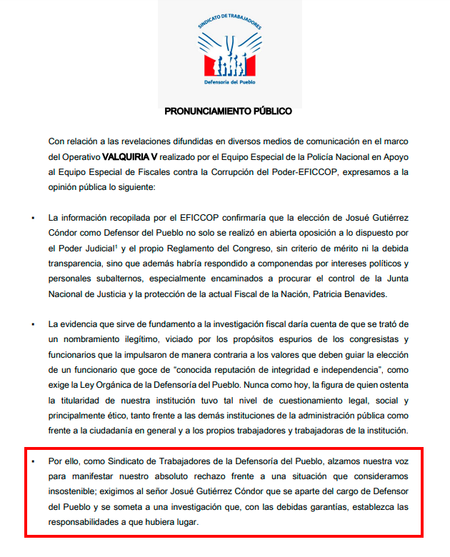 El sindicato de Trabajadores de la Defensoría del Pueblo exige a Josué Gutiérrez Cóndor, Defensor del Pueblo, que se aparte del cargo tras evidencias de su nombramiento ilegítimo.