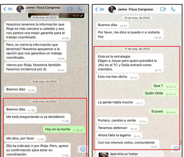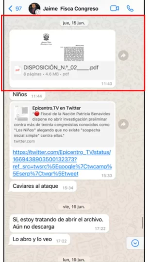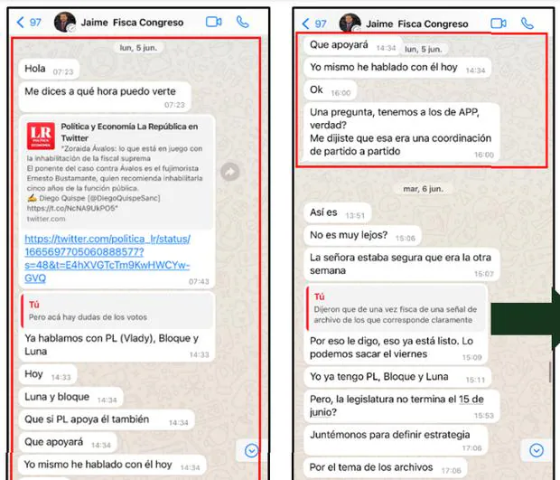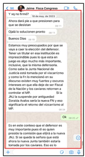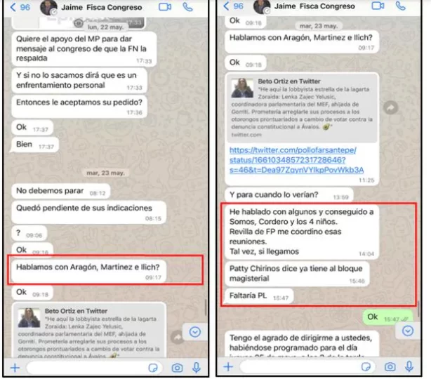 La investigación fiscal reúnes varios chats de Jaime Villanueva, asesor principal de Patricia Benavides, con congresistas a quienes les ofrece archivar la investigación por el Caso Los Niños, cambio de lograr sus votos en los tres casos.