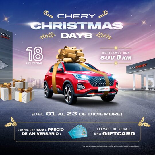 La magia de la Navidad llega este diciembre de la mano de Chery. Con motivo de sus 18 años de éxito ininterrumpido en Latinoamérica, la marca automotriz N°1 en exportaciones por 21 años consecutivos y con más de 10 reconocimientos, se viste de fiesta con los Chery Christmas Days, una campaña especial para que todos puedan vivir un diciembre lleno de sorpresas, regalos y la posibilidad de llevarse a casa una camioneta Tiggo 4 Pro 0 KM.