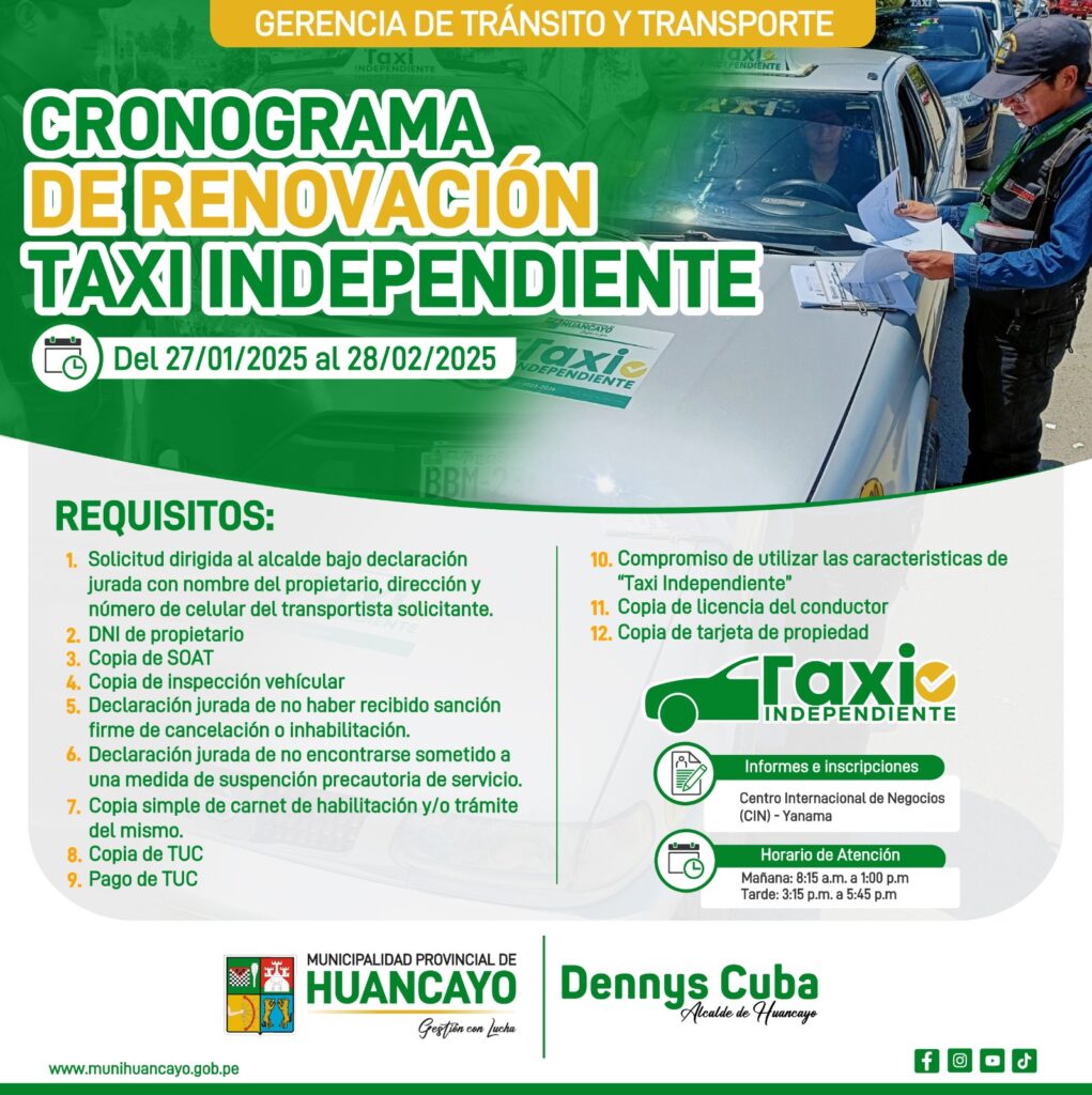 La Gerencia de Tránsito y Transporte de la Municipalidad Provincial de Huancayo anunció el lanzamiento del cronograma para la renovación de los permisos de “taxi independiente” en nuestra ciudad. Con esta medida, se renovarán más de 1,200 unidades de taxis que cumplan con los requisitos establecidos, permitiendo a los conductores continuar prestando su servicio de manera formal y segura en la ciudad.