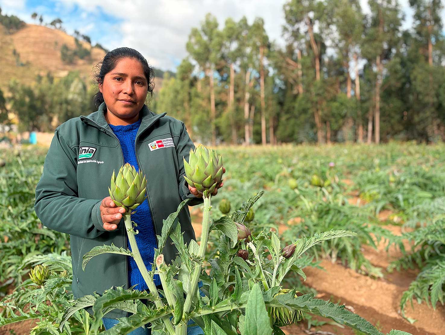 “Estas alcachofas ya han dado su tercera cosecha”, dice Martha Ñahuinripa, con su azadón en la mano y sus botas de jebe, su mirada atenta en el avance del agua por los surcos de la nueva variedad de alcachofa sembradas por primera vez en un terreno de la Estación Experimental Santa Ana, del Instituto Nacional de Innovación Agraria (INIA), en Huancayo.