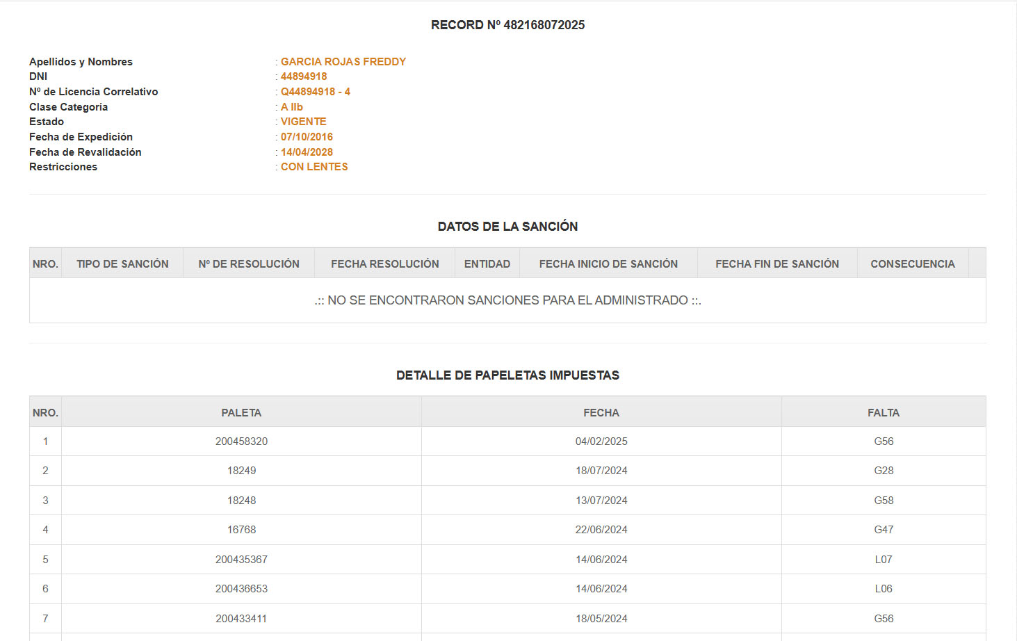 Pese a ello, basta verificar su récord de conductor en el Ministerio de Transportes y Comunicaciones para corroborar que no registra infracción alguna. Su licencia, con número Q44894918-4 y clase A-IIb, sigue vigente. Su última infracción data del 4 de febrero, cuatro días antes de la tragedia, la falta G56, considerada grave. En total, registra nueve infracciones.