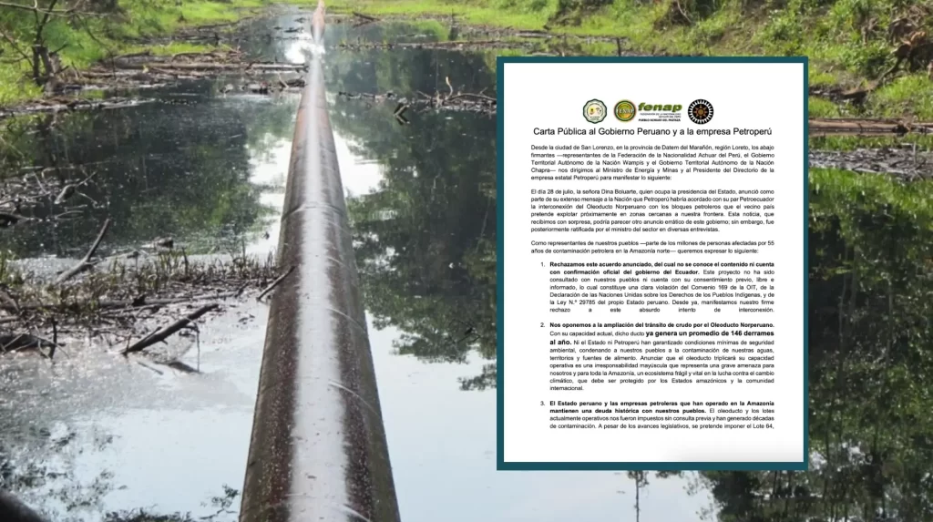 Desde la provincia de Datem del Marañón, en la región Loreto, tres organizaciones indígenas: la Federación de la Nacionalidad Achuar del Perú (FENAP), el Gobierno Territorial Autónomo de la Nación Chapra (GTANCH) y el Gobierno Territorial Autónomo de la Nación Wampís (GTANW), emitieron una carta pública dirigida al Gobierno peruano y a Petroperú. En ella, […]