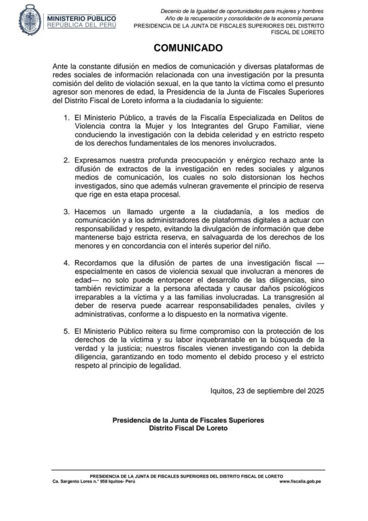 La Presidencia de la Junta de Fiscales Superiores del Distrito Fiscal de Loreto expresó su rechazo a la difusión de extractos de una investigación por presunta violación sexual en redes sociales y algunos medios de comunicación. Señaló que tanto la víctima como el presunto agresor son menores de edad, por lo que recordó que el […]