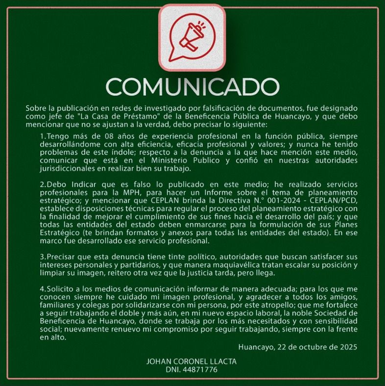 Sin embargo, que se conozca su contratación en la Beneficencia de Huancayo es para Cor0nel, una “denuncia con tinte político”, que lo plasmó en un comunicado, en el cual sostienes que sus trabajos en la municipalidad se enmarcaron en las directivas del CEPLAN y confía en que el Ministerio Público realice “bien su trabajo”.