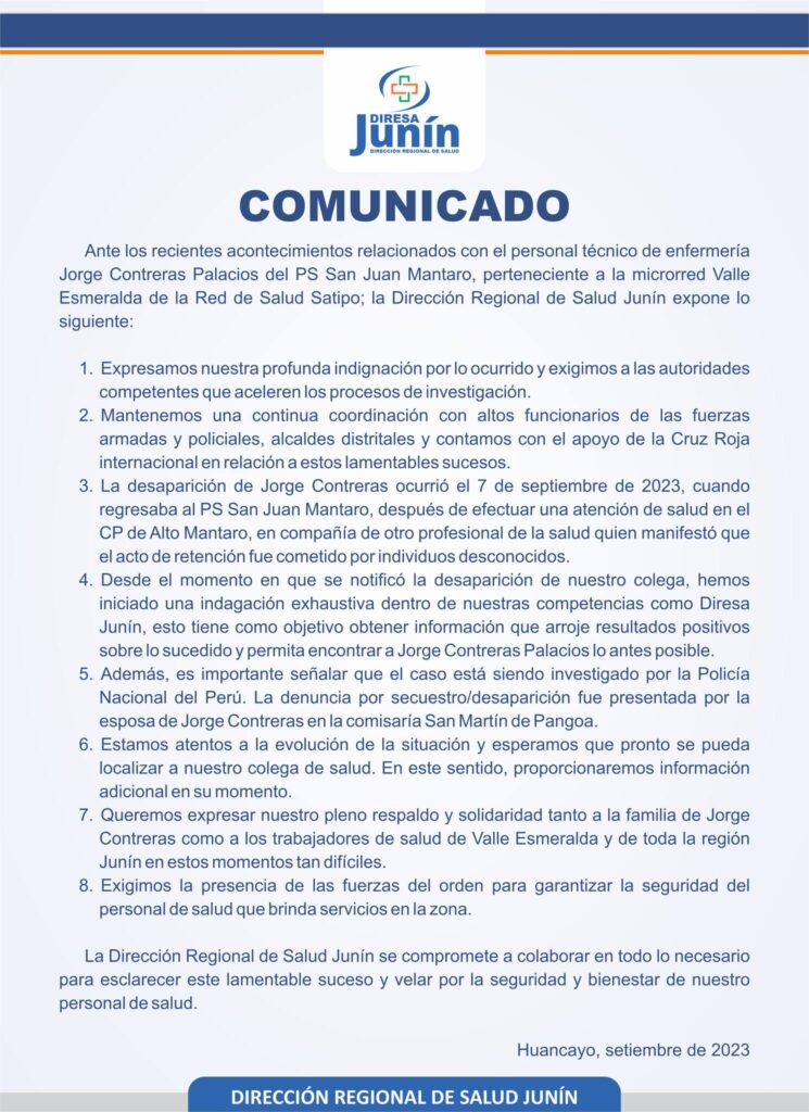En ese momento, la Diresa Junín alertó públicamente sobre la desaparición del técnico en enfermería Jorge Contreras.