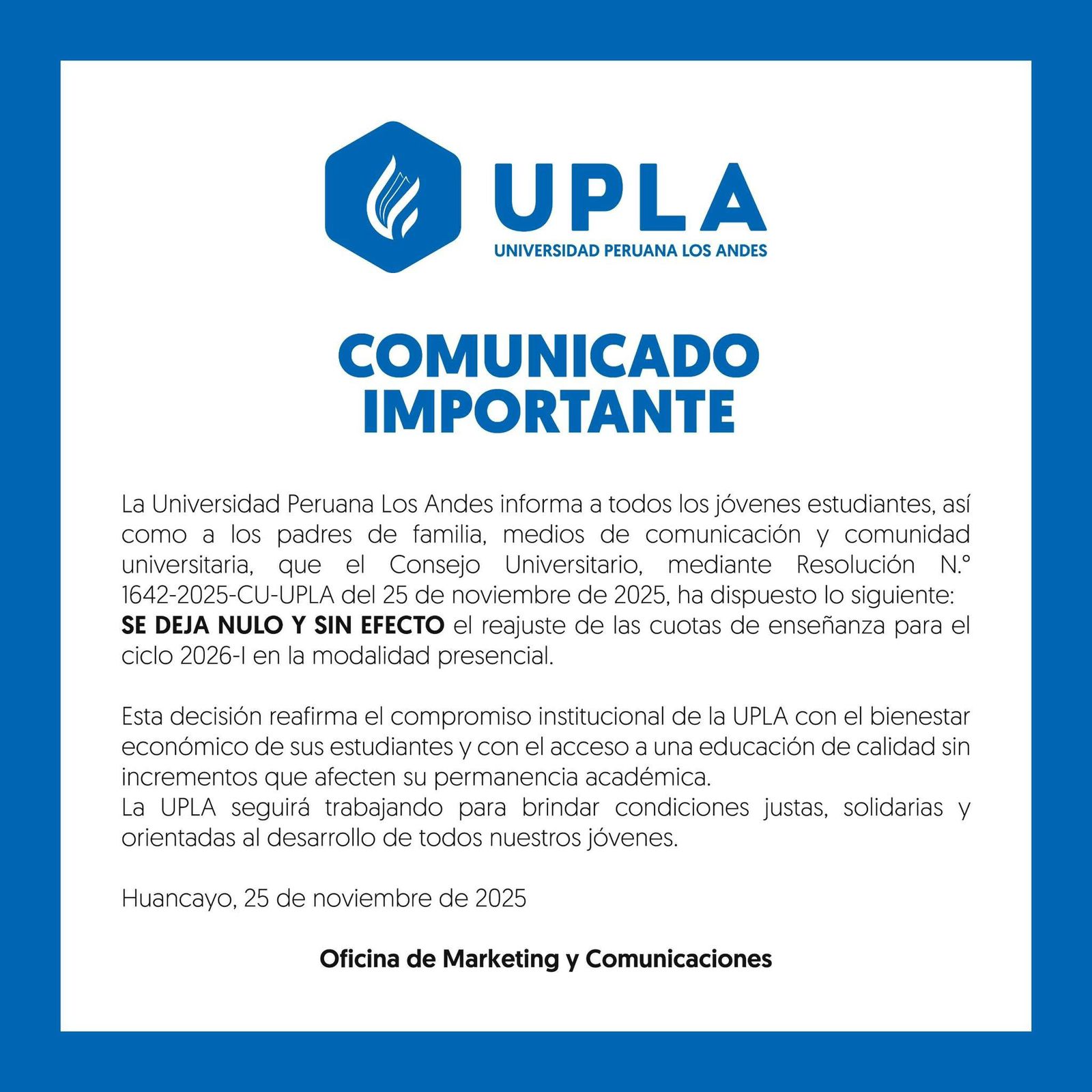 “¡Buenas noticias para nuestros estudiantes y familias! Con el compromiso de proteger la economía familiar y garantizar una educación accesible y de calidad, la Universidad Peruana Los Andes informa que queda sin efecto el reajuste de las pensiones previsto para el semestre 2026-I”, señaló en un comunicado.