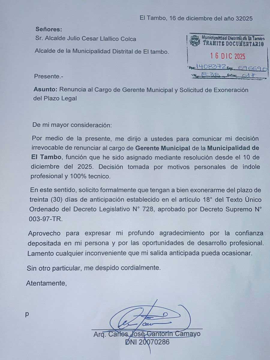 El arquitecto Carlos José Cantorín Camayo presentó su renuncia a la Gerencia Municipal de El Tambo el último 16 de diciembre de 2025, apenas 6 días después de haber asumido el cargo, tras su designación del 10 de diciembre.