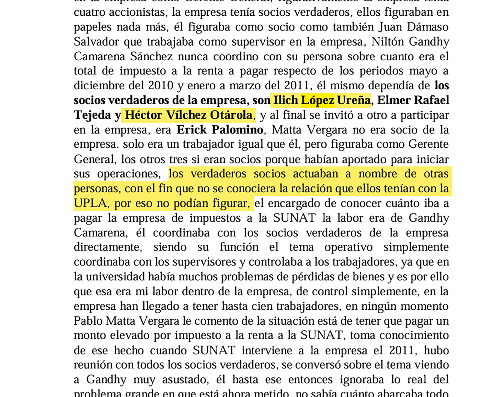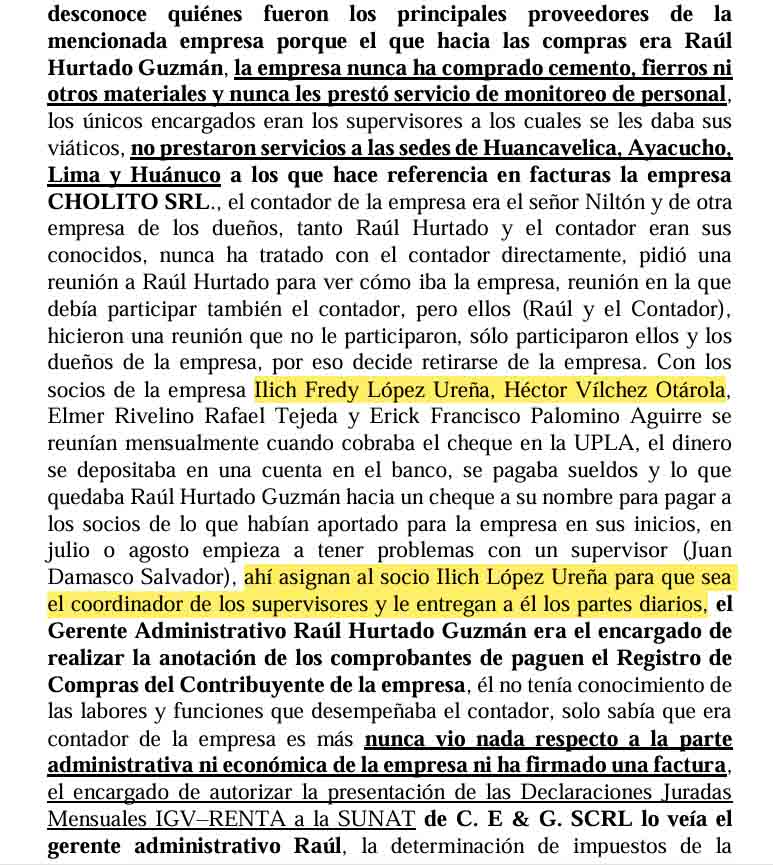 Durante el juicio oral de 2018, el gerente formal condenado, Raúl Octavio Hurtado Guzmán, afirmó que él y otros directivos solo prestaban sus nombres. Sostuvo que quienes realmente dirigían la empresa y conocían el mecanismo fraudulento eran López Ureña, Vílchez Otárola y Elmer Rafael Tejeda.