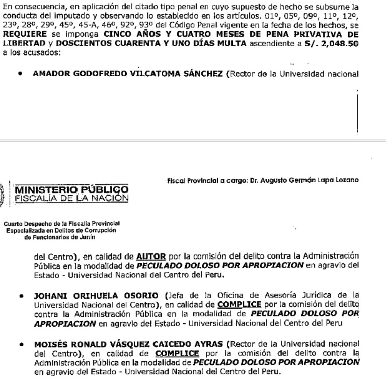 La acusación, presentada el 19 de febrero de 2026 por el Cuarto Despacho de la Fiscalía Especializada en Delitos de Corrupción de Funcionarios de Junín, alcanza también a Johani Orihuela Osorio, exjefa de la Oficina de Asesoría Jurídica, y al exrector Moisés Ronald Vásquez Caicedo Ayras, este último en calidad de cómplice.