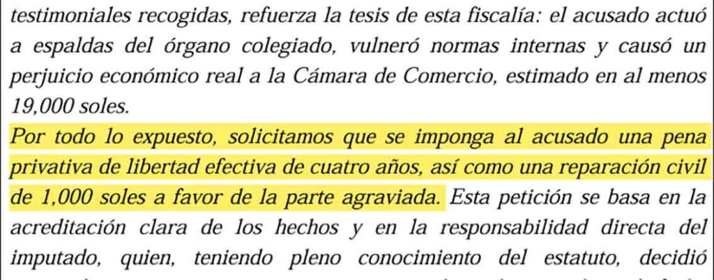En total, el Ministerio Público estima que la Cámara sufrió un perjuicio cercano a los 19,000 soles. Por ello, en los alegatos finales del juicio oral solicitó una condena de cuatro años de prisión efectiva por el delito de administración fraudulenta.
