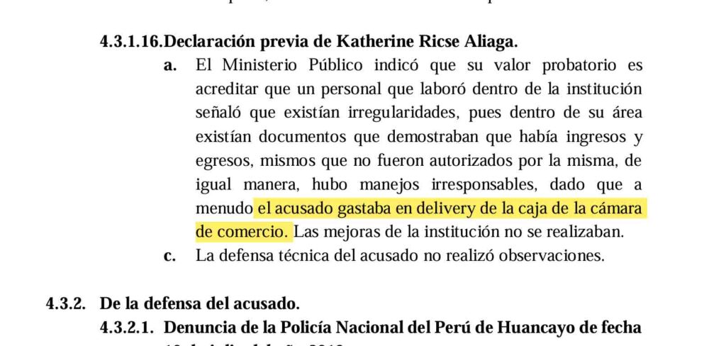 Como sustento, la Fiscalía presentó contratos firmados por Aguirre, comprobantes de pago y testimonios de trabajadores, quienes describieron una gestión deficiente. Una de las declaraciones incluso señala que el entonces presidente habría utilizado fondos institucionales para gastos personales, como servicios de delivery; en efecto, la testigo Katherine Ricse Aliaga manifestó que: “…hubo manejos irresponsables, dado que a menudo el acusado gastaba en delivery de la caja de la Cámara de Comercio. Las mejoras de la institución no se realizaban.”
