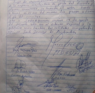 Dichas comunicaciones fueron enviadas el 17 y 19 de junio último, pero el consorcio recién actuó este miércoles 2 de julio, una semana después de que los comuneros hicieran una protesta en la plaza de Santo Domingo de Acobamba. En el acta firmada por gerente regional de Infraestructura, Rony Vejarano, regidores y pobladores, el representante del consorcio, Enrique Godiño Vílchez (hijo del precandidato), aceptó reiniciar los trabajos el próximo 14 de julio.