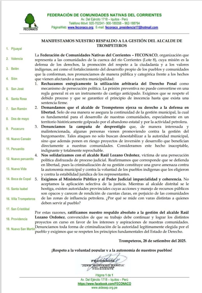 La Federación de Comunidades Nativas del Corrientes (Feconaco) manifestó su respaldo al alcalde distrital de Trompeteros, Raúl Lozano Ordóñez, y rechazó lo que califican como una “utilización arbitraria del derecho penal” en su contra. En un pronunciamiento, las comunidades indígenas cuestionaron que la prisión preventiva se use como mecanismo de persecución política y demandaron que […]