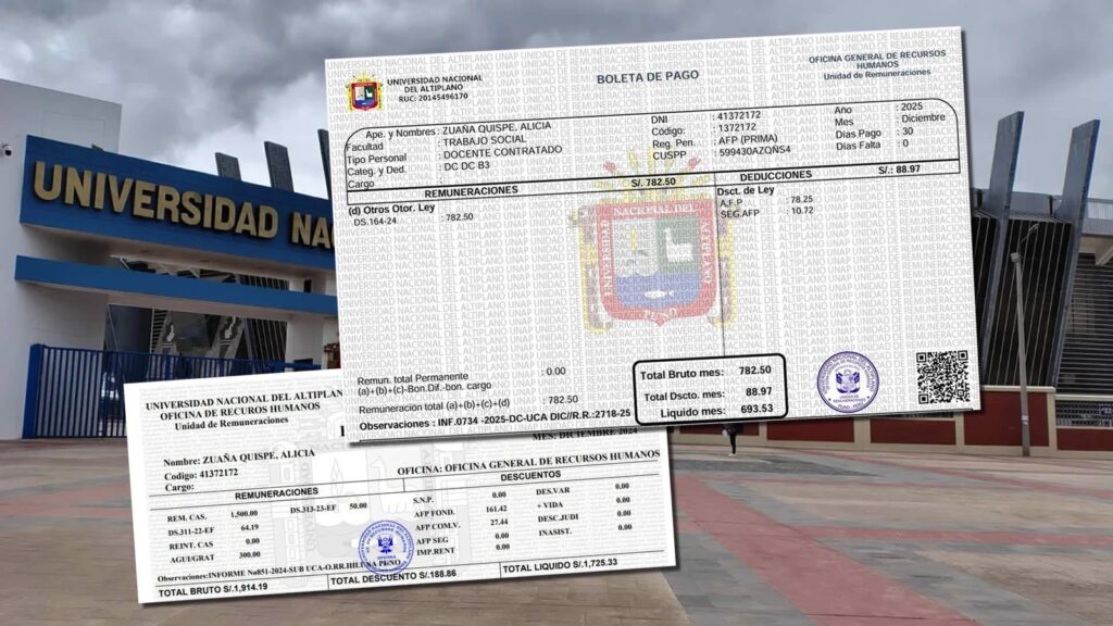 Un grupo de trabajadores del Sindicato de Trabajadores Administrativos de la Universidad Nacional del Altiplano (Sutrauna) de Puno advirtieron que Alicia Zuaña Quispe ocupa tres puestos laborales dentro de la universidad y recibe ingresos por cada uno de ellos. Según las boletas de pago revisadas, Zuaña Quispe cobra como docente en la Escuela Profesional de […]