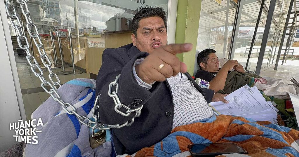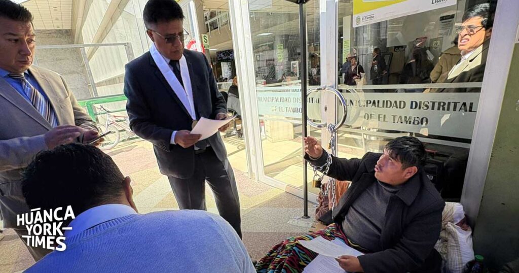 Fredy Coarita, proveedor arequipeño, lleva dos días en huelga de hambre y encadenado a la Municipalidad de El Tambo, exigiendo el pago de S/ 800 mil por instrumentos musicales entregados. Afirma que no se moverá “hasta que le paguen”.