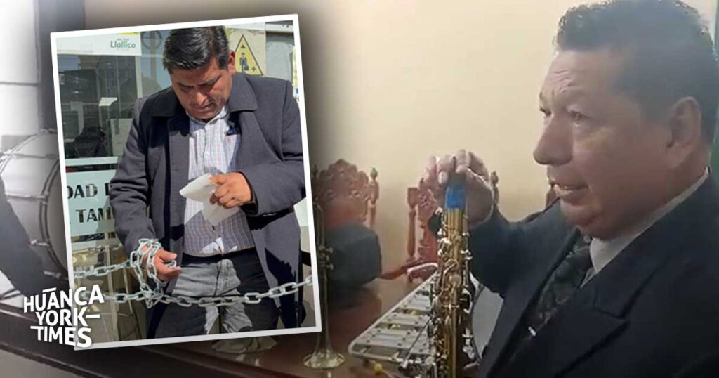 Hace un año, el alcalde Julio Llalico entregó instrumentos musicales a escuelas de El Tambo, pero hasta hoy no paga los casi S/800 mil al proveedor. El empresario Fredy Coarita, endeudado y al borde de la quiebra, se encadenó en protesta.